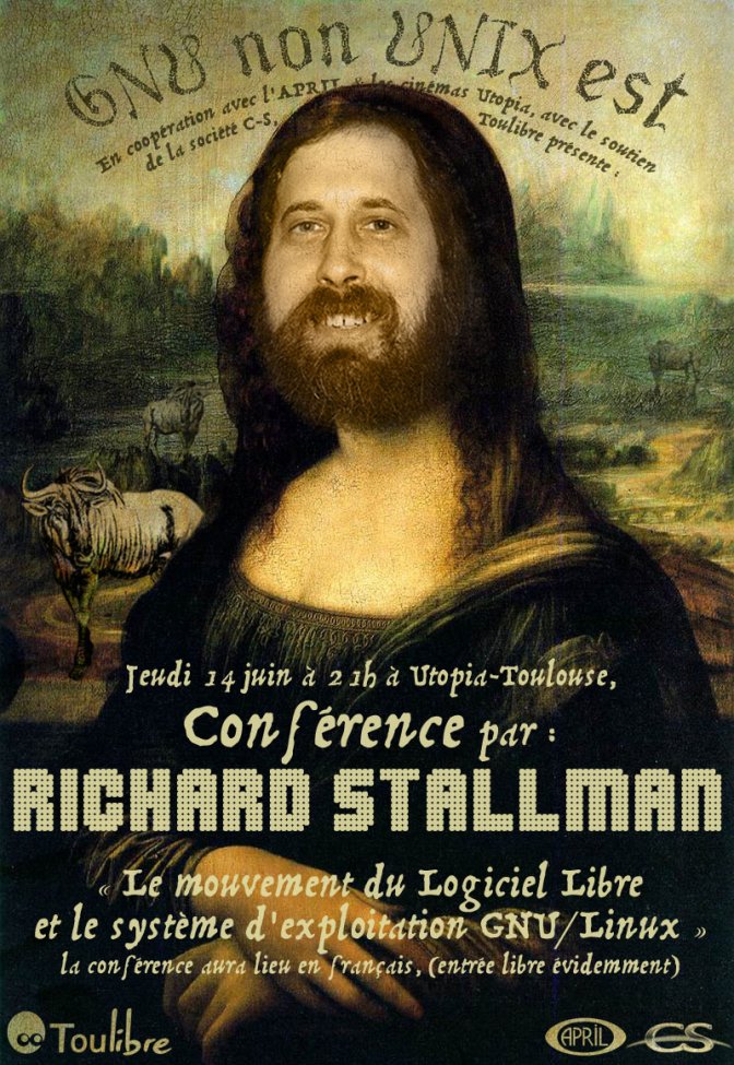 Subvertir une codification revient à la perpétuer : à ce titre, le culte de rms donne lieu à sa propre iconographie — laquelle n’a rien à envier à celle que Barthes observait autour de l’Abbé Pierre en 1953 (il y aurait beaucoup à dire, par exemple, sur la coiffure et la barbe de Stallman, mi-négligées mi-visionnaires). Cependant dans ce cas précis, le culte cède le pas au folklore : si de nombreux Libristes témoignent encore un grand respect à Richard Stallman, pour la plupart (et en particulier les générations ultérieures, celles de Linus Torvalds et de l’open-source sur lesquelles nous reviendrons prochainement) il n’est guère plus qu’un personnage haut-en-couleurs, une sorte de vieil oncle bougon et un peu radoteur que l’on tolère au repas de famille sans vraiment lui prêter attention.