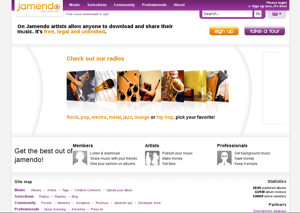 Coins arrondis, dégradés, gros boutons, évolution des couleurs et du logo : le design se modernise et surtout, pour reprendre le langage des sites d’entreprise, se professionnalise. Ce qui frappe également, c’est la conquête de l’image : les photos, dans un premier temps, se multiplient, puis s’agrandissent. Elles changent également de nature, des jaquettes d’"albums" soumises par les utilisateurs, on passe à quelques jaquettes sélectionnées, puis aujourd’hui à des photos illustratives "de stock" entièrement choisies par les responsables du site. Cependant, pour révélateur qu’il soit, l’habillage importe peu ; le logo de Jamendo m’intéresse moins que son logos, c’est-à-dire le message qu’il propage, volontairement ou non, à travers ses choix terminologiques.