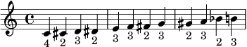 Voici le schéma de répartition auquel je suis parvenu a priori : toutes les tonalités "naturelles" (commençant sur une touche blanche du clavier) sont données trois fois (une fois de plus pour Do, dont nous verrons qu’il sert à indiquer certains points stratégiques de la pièce), et les tonalités "altérées" sont données deux fois.