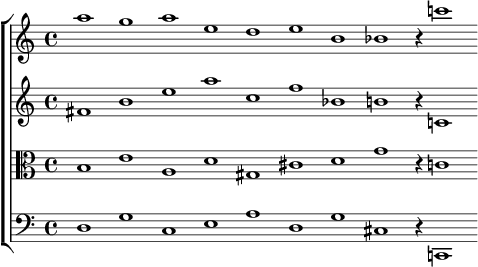 La "voix du haut", c’est-à-dire la note la plus aigüe quel que soit l’instrument qui la donne, suit des gammes diatoniques en notes non-altérées : de do à do', de ré à ré', et ainsi de suite. Un problème se pose d’ailleurs arrivé au si (c’est-à-dire la septième variation), puisque selon le tableau ci-dessus, les instruments sont (de bas en haut) en La bémol, Fa, Do et Mi bémol majeurs. Seul le violon II (qui joue la gamme de Do) peut donner un si naturel... mais un seul ! Je choisis donc de le garder en réserve pour l’arrivée de la gamme montante, et de remplacer le si de départ par un agrégat chromatique (<sol lab la sib>), un peu comme un mauvais élève qui fait un pâté sur sa copie lorsqu’il ne parvient pas à trouver l’orthographe correcte d’un mot.