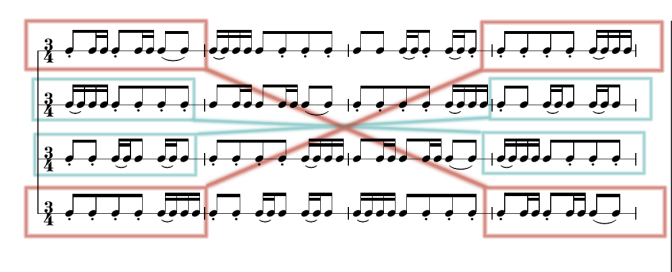 Rythmiquement, six mesures permettent d’envisager deux blocs de trois mesures : le premier sera à sept temps, le deuxième à cinq (afin de s’amuser avec des chiffres impairs autour de six). Encore une fois, la répartition des durées (je compte ici à la double-croche) donne lieu à une forme d’écriture combinatoire :