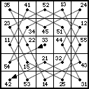 L’on en concluera qu’il existe en tout 25 mesures à sept temps possibles, soit cinq possibilités pour monter puis cinq possibilités pour redescendre : l’on pourrait exprimer ces possibilités dans un plus grand tableau de cinq rangées et cinq colonnes — autant dire, un "damier" de cinq cases par cinq. Et c’est ce damier qu’explorent ici la main droite et la main gauche, en accomplissant chacune dans un sens différent le parcours d’un cavalier de jeu d’échecs — suivant la figure suivante obligeamment fournie par mon excellent collègue oulipote Gilles Esposito-Farèse :